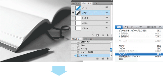 チャンネルパレットのシアン(マセンダ)を選択した状態で【選択】→【ペースト】